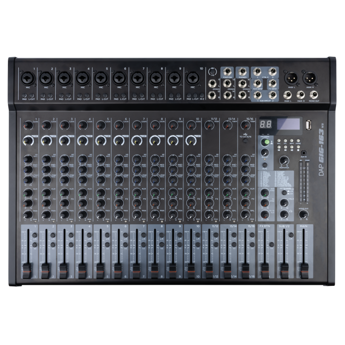 The DAP GIG-163 V2 is a compact yet capable 16-channel mixer designed for live performances, studio sessions and hybrid setups. It offers a wide range of inputs, routing options, professional features and onboard effects, making it ideal for musicians, sound engineers and content creators who demand flexibility without compromising on sound quality.
