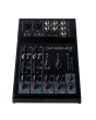 Channels 1 and 2 feature XLR/jack combo inputs with a mic preamp, -20 dB pad switch, 48 V phantom power, and low-cut filter. Channel 2 also includes a Hi-Z mode, allowing direct connection of instruments such as electric guitars. Both channels are equipped with gain control, compressor, high/low EQ knobs, pan control, mix level knobs, and clip LEDs for precise signal management. Channels 3/4 and 5/6 provide stereo line-level inputs via dual 6.3 mm jacks, each with pan and mix level controls. Additional inputs include a 3.5 mm Aux minijack and BT connectivity, both with dedicated mix level knobs and status LEDs.