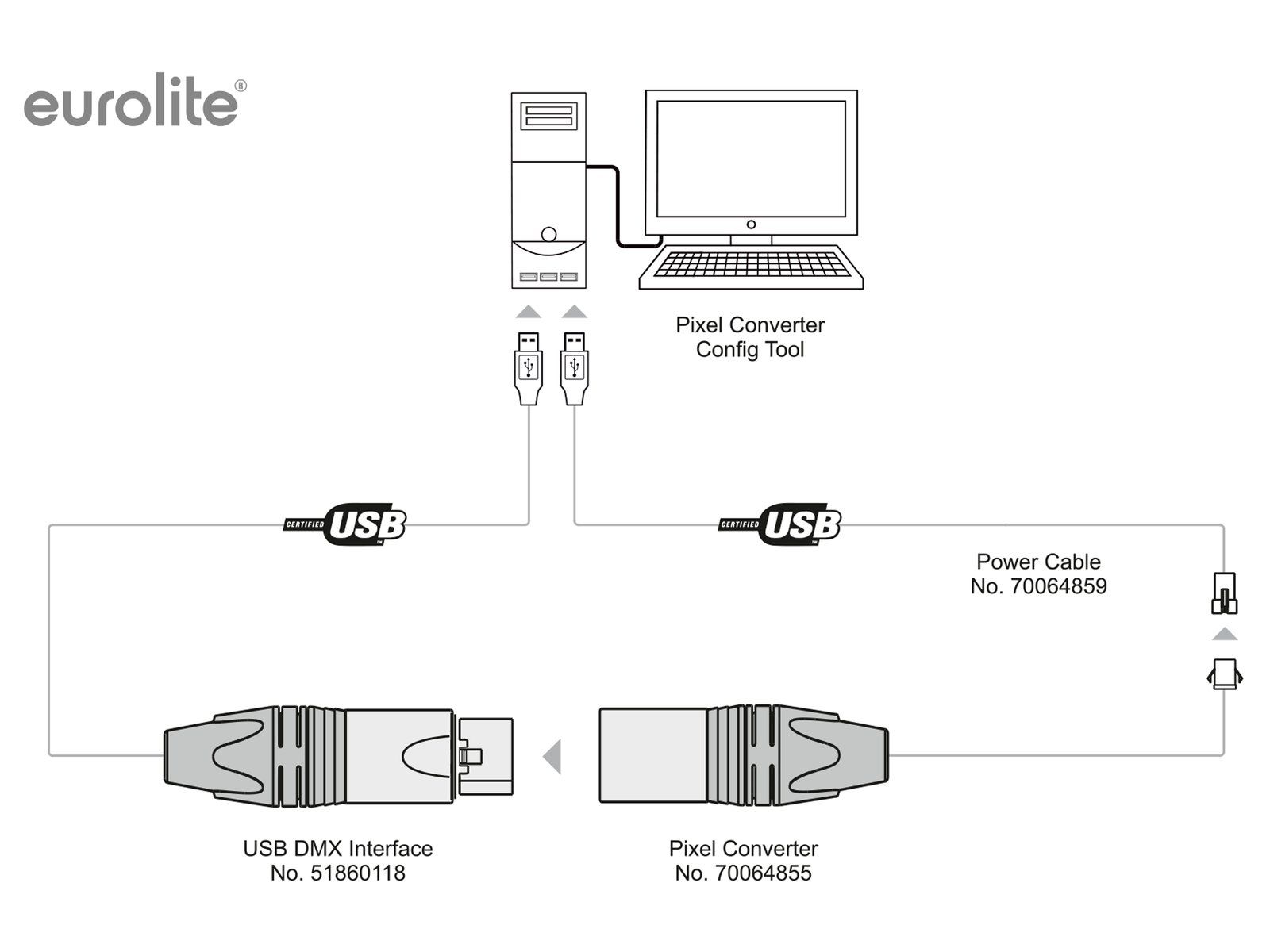 Levert alleen stroom! Voor de configuratie van de "DXT DMX Pixel Converter PRO" heeft u een extra "USB-DMX512-interface/uploadadapter" (51860118) nodig!