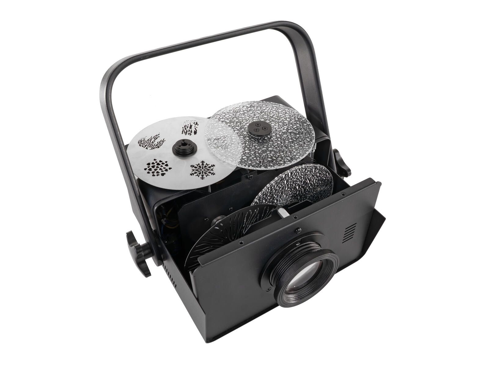 - 2 structure wheels, 1 animation wheel and 1 gobo wheel with 5 depictions included in the delivery