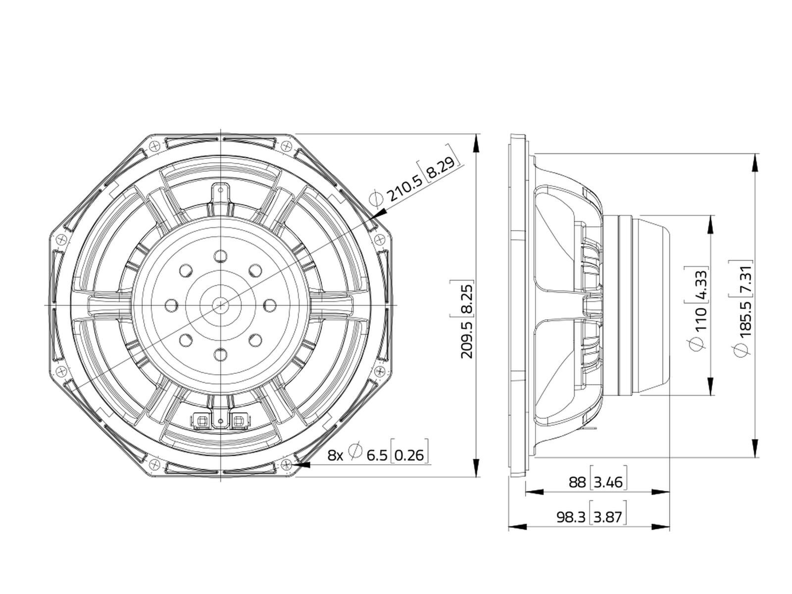 Speaker: | Woofer 8" with neodymium magnet Basket material: aluminum Conematerial: cardboard/paper Voice coil lows 2" |