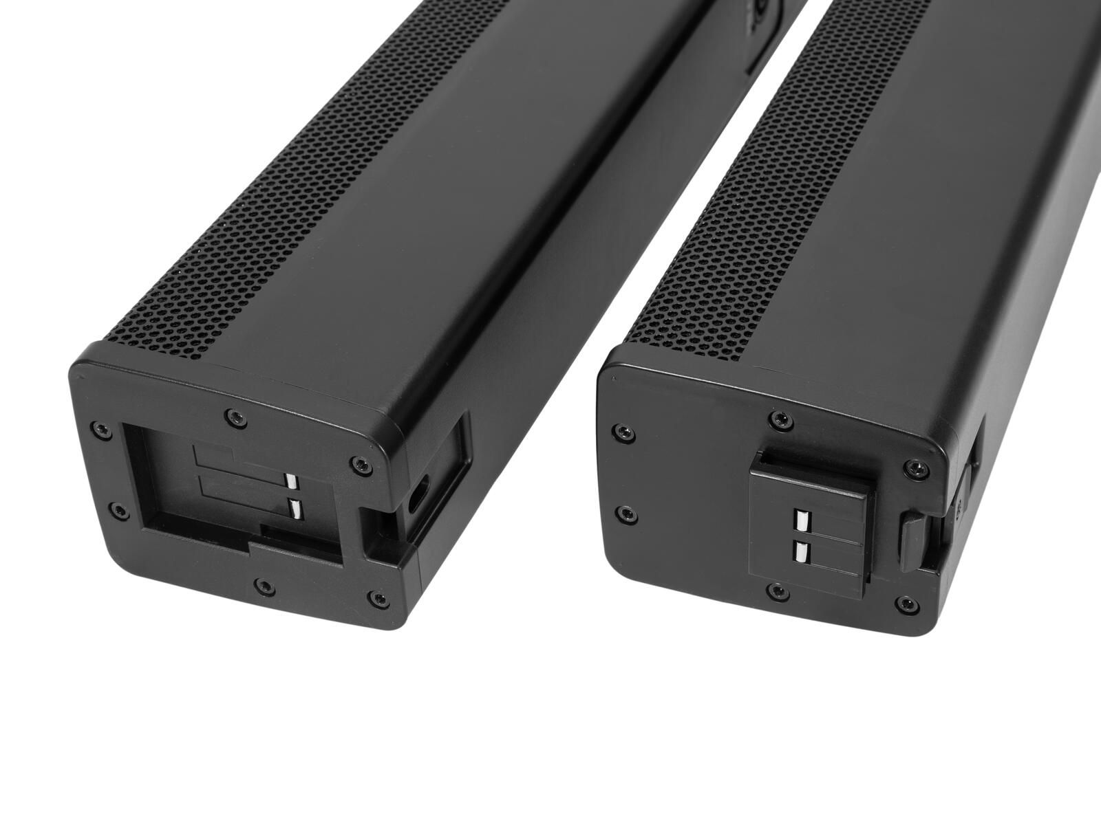 The intelligent design with a 12" subwoofer and satellite speakers allows for a 2.1 setup as well as a full-range speaker setup in mono mode. The satellites can be stacked without cables and be linked to the subwoofer cabinet by means of a smart click mechanism.